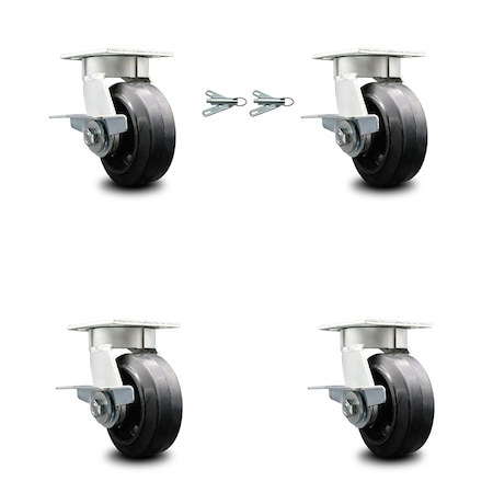 Kingpinless Rubber on Cast Iron Swivel Top Plate Caster Set 4 w/5" x 2" Black Wheels-Includes 2 Swivel with Brakes and Bolt on Swivel Locks&2 Swivel with Brakes-1600lbs Total Cpty-Service Caster Brand
