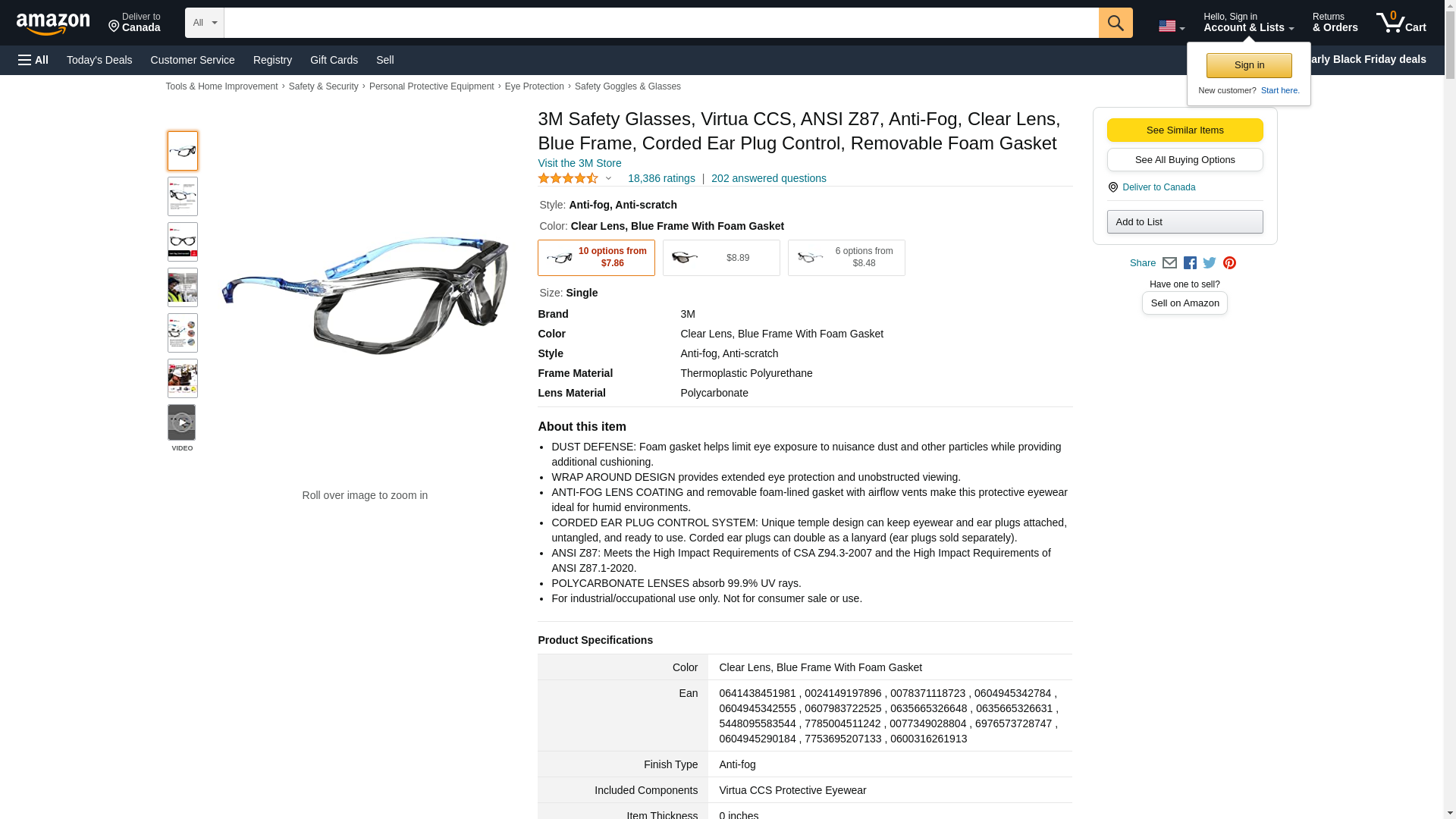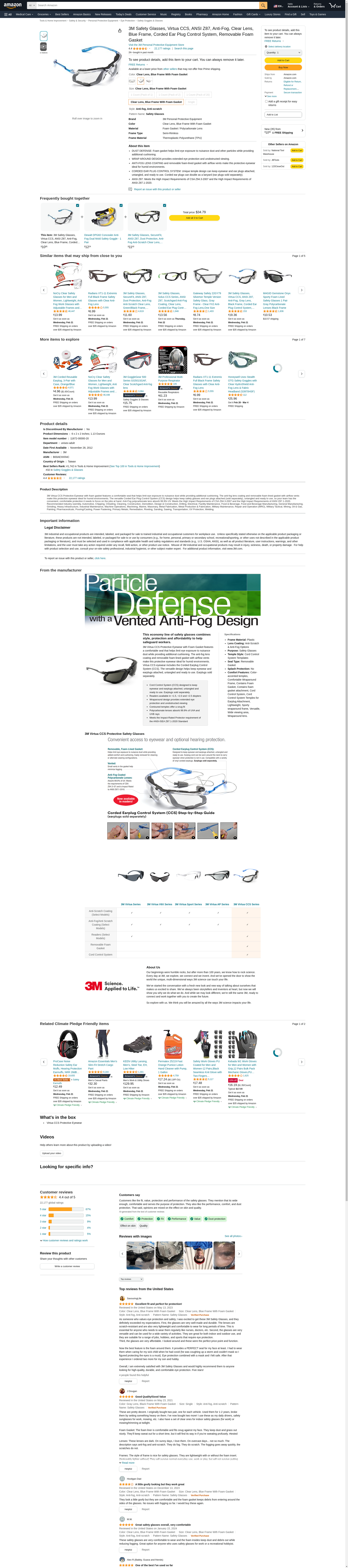 3M Safety Glasses, Virtua CCS, ANSI Z87, Anti-Fog, Clear Lens, Blue Frame, Corded Ear Plug Control System, Removable Foam Gasket