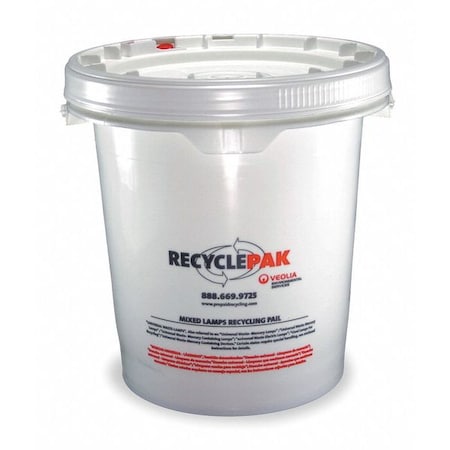 Mixed Lamp Recycling Pail, 5 gal, For Lighting Technology CFL, LED, For Lighting Shape (45 to 90) Small and Medium CFL or LED, Prepaid Disposal Included Yes, Weight Capacity 55 lb, Volume Capacity 5 gal, 14 in Length, 10 in Width, 11 1/2 in Depth, 14 5/32 in Top Dia., 10 1/2 in Bottom Dia., UN Approval No. 1H2/Y25/S/XX*, Liner Type 4 Mil Poly Liner