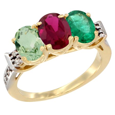 14K Yellow Gold Natural Green Amethyst, Enhanced Ruby & Natural Emerald Ring 3-Stone 7x5 mm Oval Diamond Accent, sizes 5 - 10