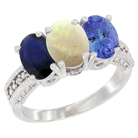 14K White Gold Natural Blue Sapphire, Opal & Tanzanite Ring 3-Stone 7x5 mm Oval Diamond Accent, sizes 5 - 10