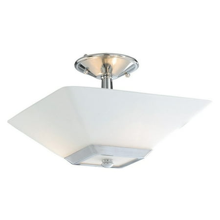 <ul><li>Semi-flush mount in transitional style</li><li>Chrome frame and frosted opal glass shade</li><li>Rated for damp locations</li><li>Requires (2) 100-watt medium base bulbs (not included)</li><li>Dimensions: 13L x 13W x 10H inches</li></ul>