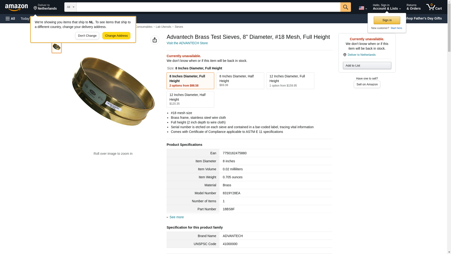 The Advantech #18 Inch Brass Test Sieve is of impeccable quality. Multiple points of inspection are built into the manufacturing. The measurement system for the wire cloth is traceable to NIST standards and each sieve is labeled for traceability. The die-formed frame assures a proper fit, superior quality and performance, guaranteeing that the American Society for Testing Materials (ASTM) specifications are always met. Serialized to meet the highest grade quality assurance systems for traceability of measurement devices. The serial number is etched on each sieve, and contained in a bar-coded label, tracing vital information such as when sieve was manufactured and which lot of wire cloth was used to manufacture each sieve. Comes with a Certificate of Compliance applicable to ASTM E 11 specifications bearing the serial number of your sieve and the ship date. All safeguards are in place to support and ensure your quality assurance program. US Standard Mesh Size: #18 Inch. Frame Material: Brass. Wire Cloth Material: Stainless Steel. Sieve Height: Full. Sieve Diameter: 8 Inch. Advantech #: 18BS8F.