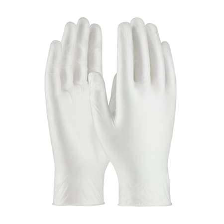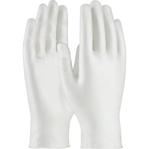 Industrial grade, powder free, 5 mil., 9.6 inch length. Rolled beaded cuff. White. No natural rubber latex proteins. Complies with FDA regulations for food contact. 1CFR1-1. Properties meet ASTM requirements for vinyl gloves. X-Large.
