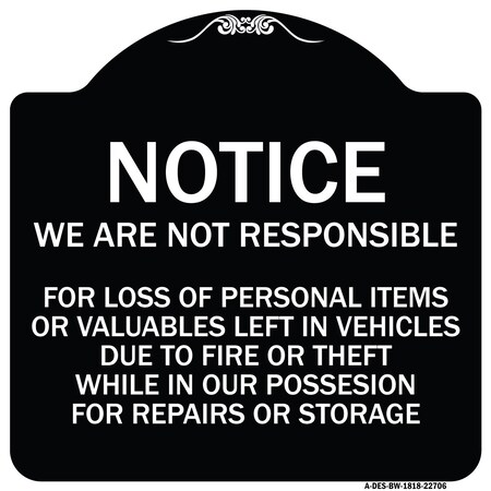 We Are Not Responsible for Loss of Personal Items or Valuables Left in Vehicles Due Aluminum Sign