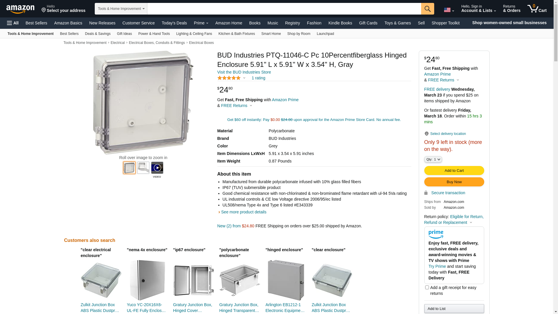 BUD Industries PTQ-11046-C Pc 10Percentfiberglass Hinged Enclosure 5.91" L x 5.91" W x 3.54" H, Gray