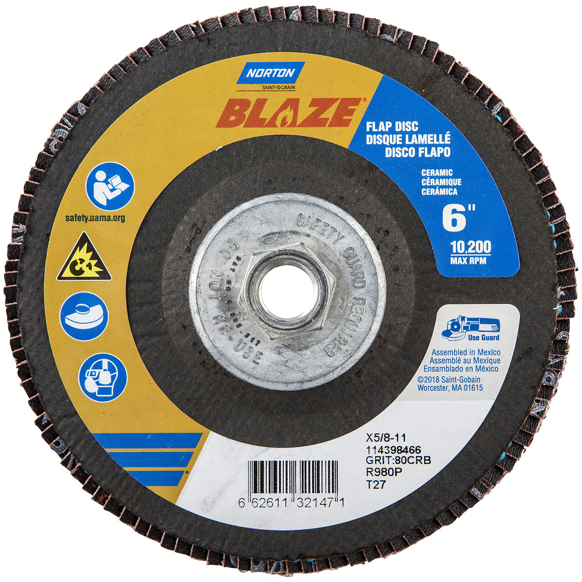 <br /><br /> Item: Flap Disc<br /> Abrasive Disc Type: Type 27<br /> Disc Diameter: 6"<br /> Mounting Hole Size: 5/8"-11<br /> Abrasive Grit: 80<br /> Abrasive Grade: Medium<br /> Disc Backing Material: Cloth<br /> Abrasive Material: Ceramic<br /> Abrasive Type: Coated<br /> Series: Blaze R980P<br /> Backing Weight: Y<br /> Max. RPM: 10,200