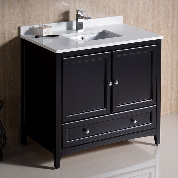Whether you prefer a modern look or a more traditional style, the Fresca Oxford Traditional Bathroom Cabinet is a great starting point when updating your bathroom. This shaker style wood cabinet has a rich Espresso finish and features a quartz countertop with elegant sink that would blend beautifully with any decor. Two doors open to reveal a roomy storage compartment with plenty of space for all your toiletries. To give this piece a unique touch, a handy dovetail drawer is positioned along the base of the cabinet, providing additional space. This lovely cabinet features soft-close doors and polished chrome pulls.<br/><br/>Features :<br/><br/>- Dimensions of Vanity: 36"W x 20.38"D x 34.75"H<br/>- Materials: Solid Wood Frame, MDF Panels, Quartz Stone Countertop, Ceramic Undermount Sink with Overflow<br/>- Single Hole Faucet Mount (Faucet Not Included)<br/>- 2 Soft Close Doors<br/>- Soft Close Dovetail Drawer<br/>- Seamless Countertop with Matching Backsplash<br/>- DTC Soft Closing Hinges and Slides<br/>- Base Cabinet, Countertop, Sink, and Hardware Included.<br/><br/>Specifications :<br/><br/>- Product Dimensions : 36" W x 20.38" D x 34.75" H<br/>- Number of Doors : 2.