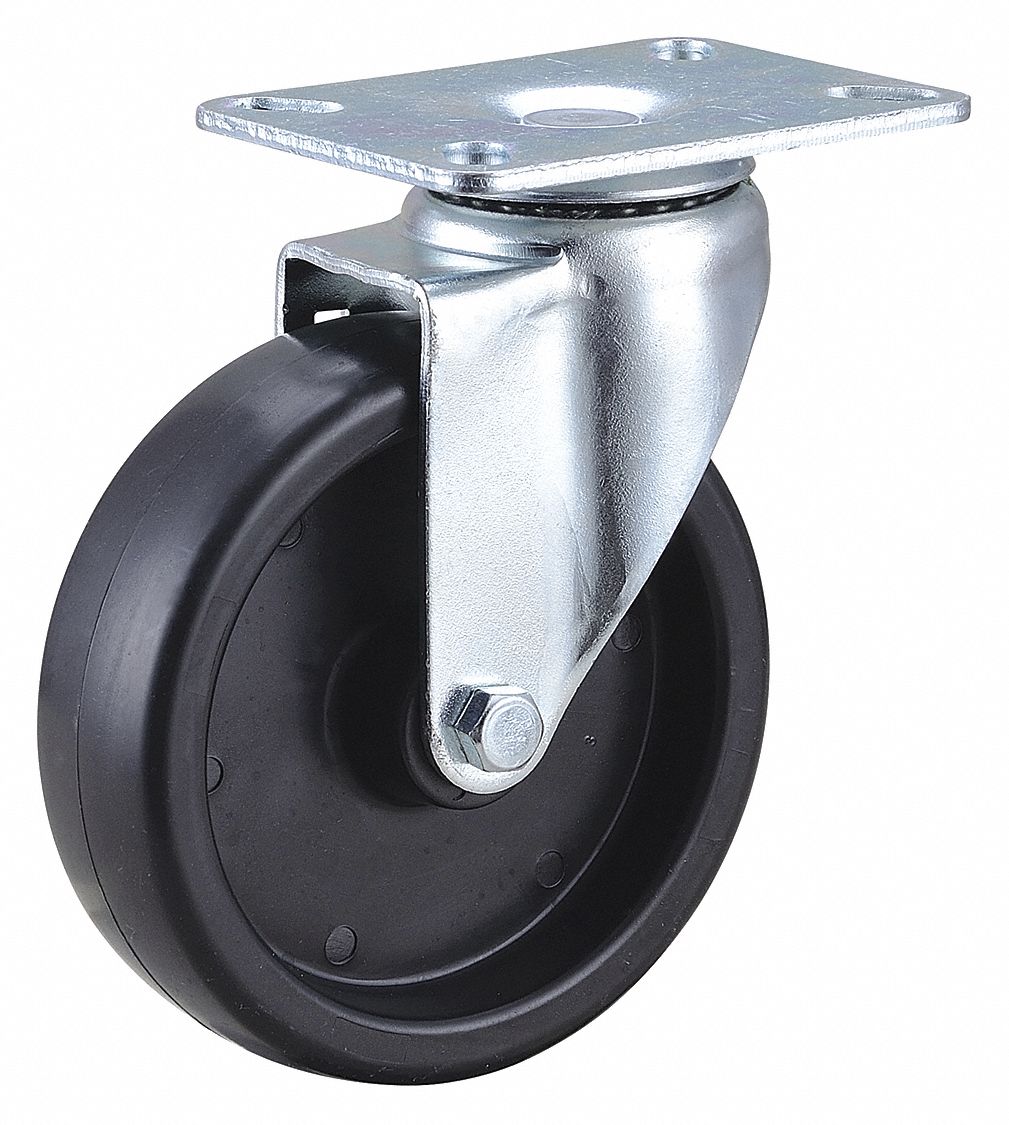 ' Swivel Plate Caster, Load Rating 350 lb., Wheel Dia. 5 In., Wheel Width 1-1/4 In., Overall Height 6-1/8 In., Wheel Material Polyolefin, Inside Bolt Hole Spacing 1-3/4 x 3 In., Outside Bolt Hole Spacing 2-3/8 x 3-3/8 In., Plate Type A, Wheel Color Black, Core Material Polyolefin, Raceway Double Ball, Wheel Bearings Plain Bore, Replacement Wheel IB0504106G, Plate Size 3-1/8 x 4-1/8 In., Durometer 70 Shore D, Core Color Black, Mounting Bolt Dia. 5/16 In., Frame Material Steel '