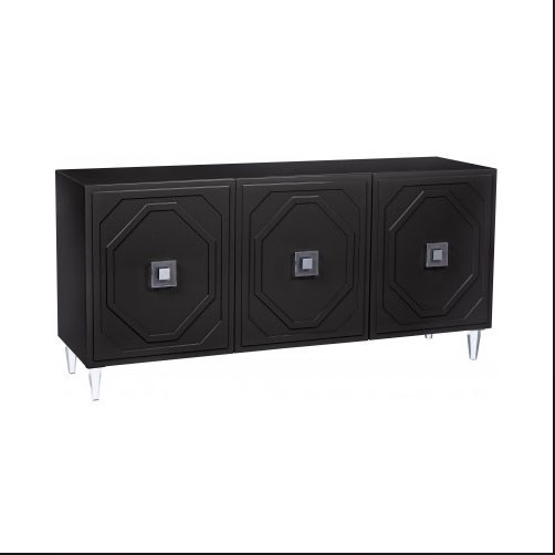 - This large kitchen buffet table will instantly transform a room with its sophisticated and modern vibe, featuring a classic geometric pattern on its soft close, self closing doors, as well as Lucite legs and hardware.