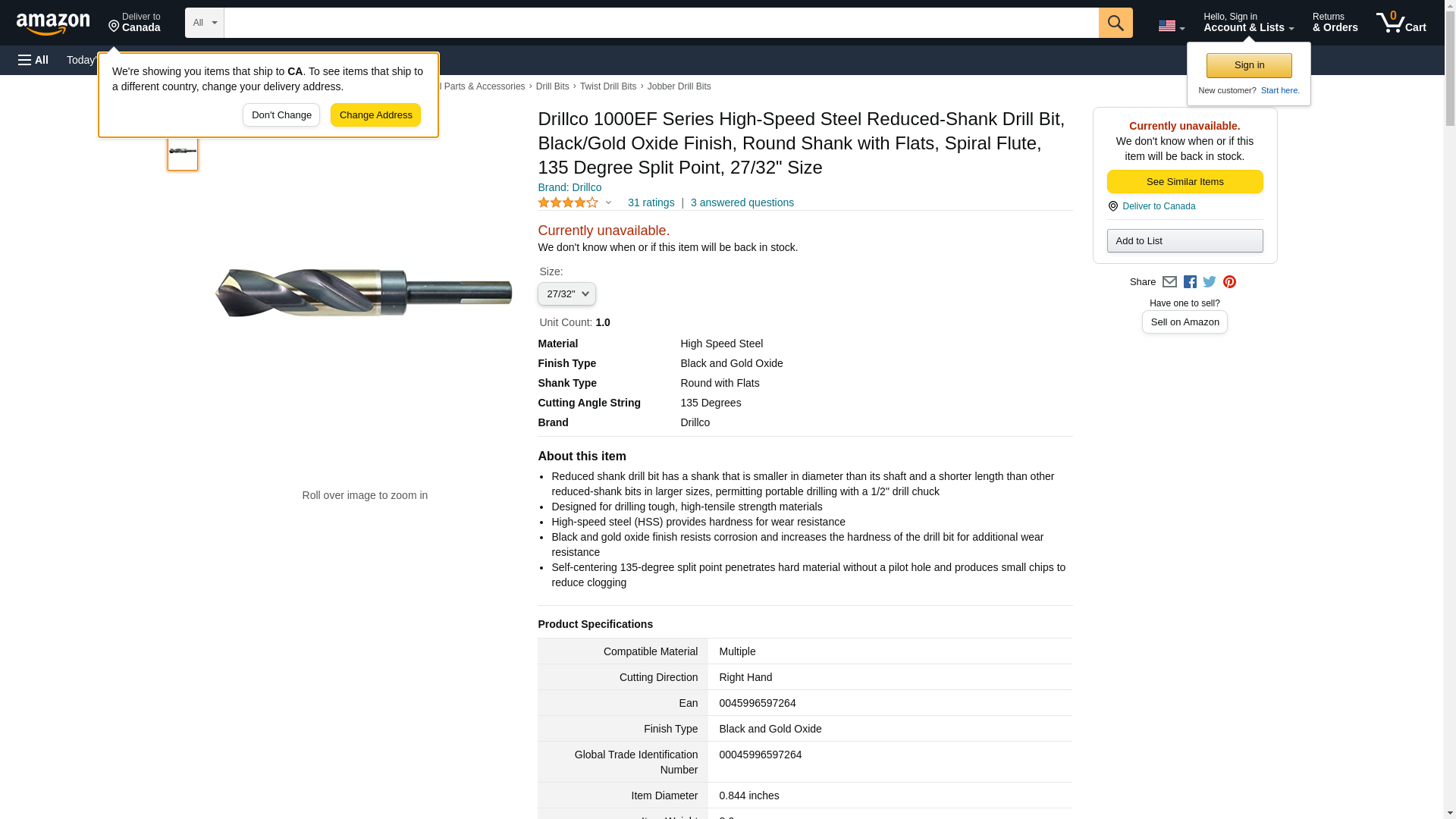 Drillco 1000EF Series High-Speed Steel Reduced-Shank Drill Bit, Black/Gold Oxide Finish, Round Shank with Flats, Spiral Flute, 135 Degree Split Point, 27/32" Size