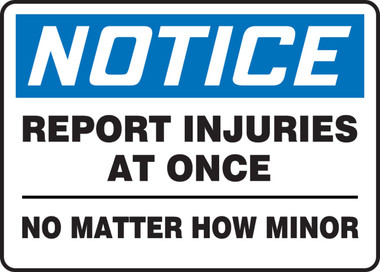Accuform MFSD810VA Aluminum Sign, Legend "Notice Report Injuries at Once NO Matter How Minor", 10" Length x 14" Width, Blue/Black on White