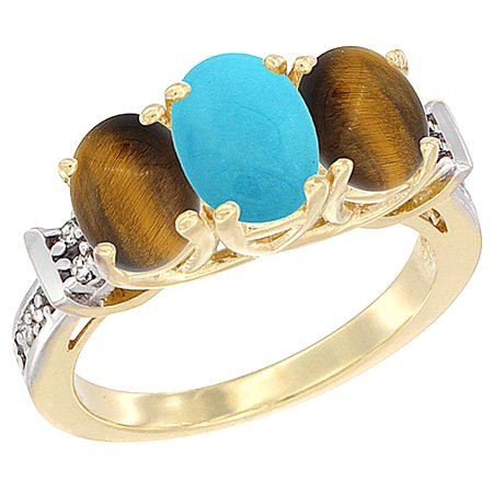 10K Yellow Gold Natural Turquoise & Tiger Eye Sides Ring 3-Stone Oval Diamond Accent, sizes 5 - 10