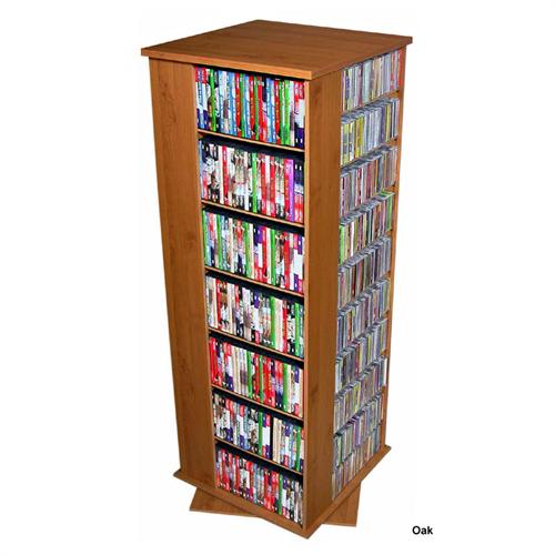 Dimensions 63"x24"x24" Media Storage CDs 1600, DVD's 756, VHS Tapes 448, Disney Tapes 336. Organize An Entire Media Collection These 4 sided beauties will brighten up any room. Because they rotate a full 360 you will never have to strain your neck locating your favorite CD, DVD, Video or Cassette. Nearly all the shelves are adjustable so even odd sized media like Disney Tapes can be accommodated. Constructed from durable laminated wood composites these towers are stain resistant and easy to clean.