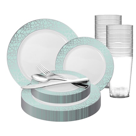 White with Turquoise Blue and Silver Mosaic Rim Round Plastic Wedding Value Set, 720PK