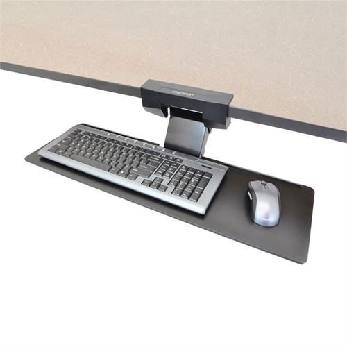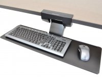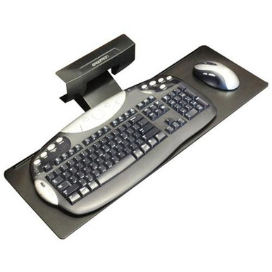 Ideal for any word-processing office application, this underdesk arm allows you to lift, lower and tilt your keyboard offering optimum comfort for a wide range of users. Single knob adjustment for both height and tilt settings. One-piece phenolic tray stores conveniently under worksurface when not in use; extends and retracts on smooth ball bearing slides. Accommodates both larger ergonomic keyboards and mouse equipment. Easy and flexible installation; clamps to front edge of 3/4" to 1-1/2" worksurface or attach under the surface with four screws. Color: Black; Capacity (Weight): 3 lbs.; Workstation Type: 90° Corner; Curved; Desktop; Diagonal; Straight; Height (+/- Desktop): (+0"/-6").