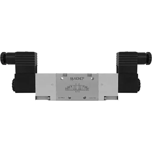 Aignep USA 5/3 Dbl Solenoid Vlv, Ext Pilot, Pres. Cntr, Spr Cntred, G1/4, 24V DC/2W Coil, Black