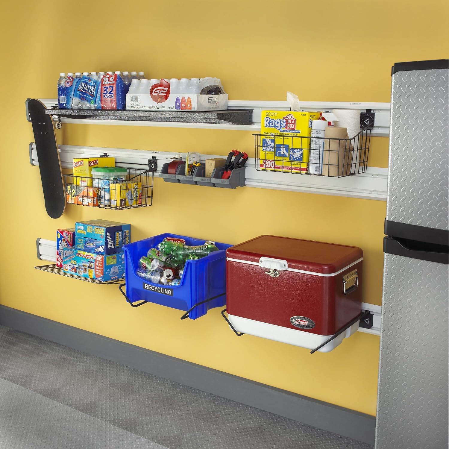- Great for storing totes, recycle bins and coolers up off the floor