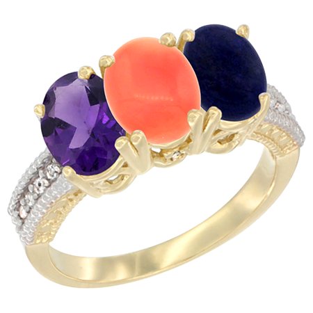 14K Yellow Gold Natural Amethyst, Coral & Lapis Ring 3-Stone 7x5 mm Oval Diamond Accent, sizes 5 - 10