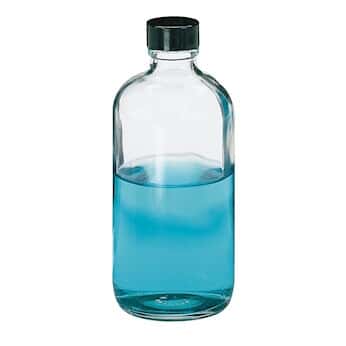 - Clear narrow-mouth Boston-round lab bottle with glass body for solidity, transparency, solution compatibility, versatility, and heat, gas, and vapor resistance