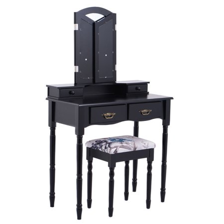 Made of thick MDF panel and wood legs, this vanity table set is sturdy and durable enough to serve you a long time. The dressing table has 4 drawers providing plenty of storage space. The handles on the drawers make them easy to pulling out. The spacious tabletop is large enough for you to display and organize your all kinds of cosmetic and makeup tools. The large tri-fold mirror easily reflects images clearly.The table comes with a cushioned stool with follower patterns, so you can sit comfortably when doing makeup.