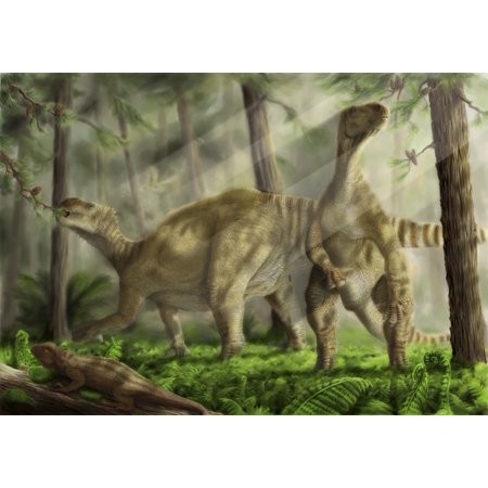 A pair of Iguanodon bernissartensis grazing Belgium Early Cretaceous Period Ardeosaurus in foreground Archaeopteryx in background Poster Print