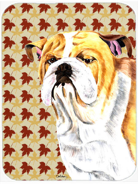 Carolines Treasures SC9214LCB 12 x 15 in. Bulldog English Fall Leaves Portrait Glass Cutting Board, Large