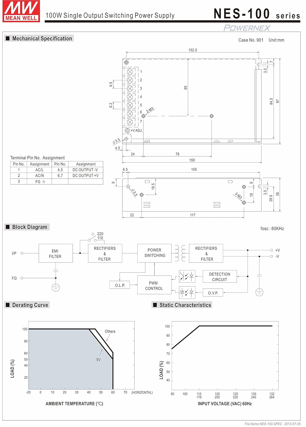 | Feature | Brand:MEAN WELL<br> Model:NES-100-5<br>Output:100W 5V20A <br> |