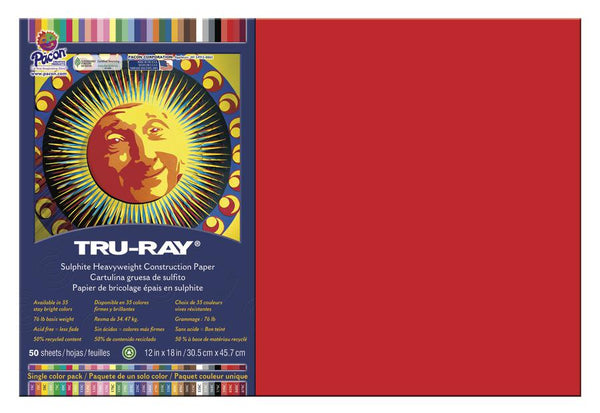 Heavy 76 lb. 100% vat-dyed sulphite with longer stronger fibers. Tru-Ray Construction Paper is tough enough to take scoring folding and curling without cracking and tearing. ItÀÂs superior fade-resistance keeps projects brighter and fresher longer. Available in 35 stay-bright colors. 50 Sheets per package. Acid free. 50% recycled fiber content and recyclable.