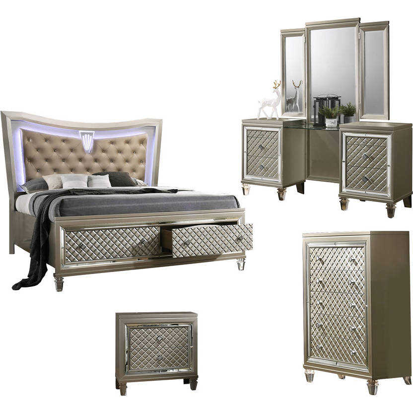 Best Quality VEN-Q3V-C Ven 4 Piece Set with Vanity & Queen Bed in Champagne Silver Wood