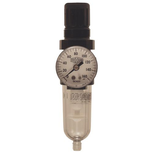 <p><strong>Dixon, B07-202AG, Series 1 Miniature Filter/Regulator, Automatic Drain, Port 1/4"</strong></p><p><strong>Features</strong></p><ul><li>Automatic Drain</li><li>Transparent Bowl</li><li>Relieving type</li><li>5 micron element</li><li>1 oz. reservoir</li><li>Push to lock adjusting knob</li><li>Supplied with a GC620 gauge</li></ul><p><strong>Note</strong></p><ul><li>Bowl guard not available</li></ul><p><strong>Safety notes</strong></p><ul><li>FRL's are designed for air service only, unless otherwise indicated.</li><li>Pressure rating given at ambient temperature 70°F.</li><li>SCFM ratings at 90 PSIG inlet pressure</li></ul>