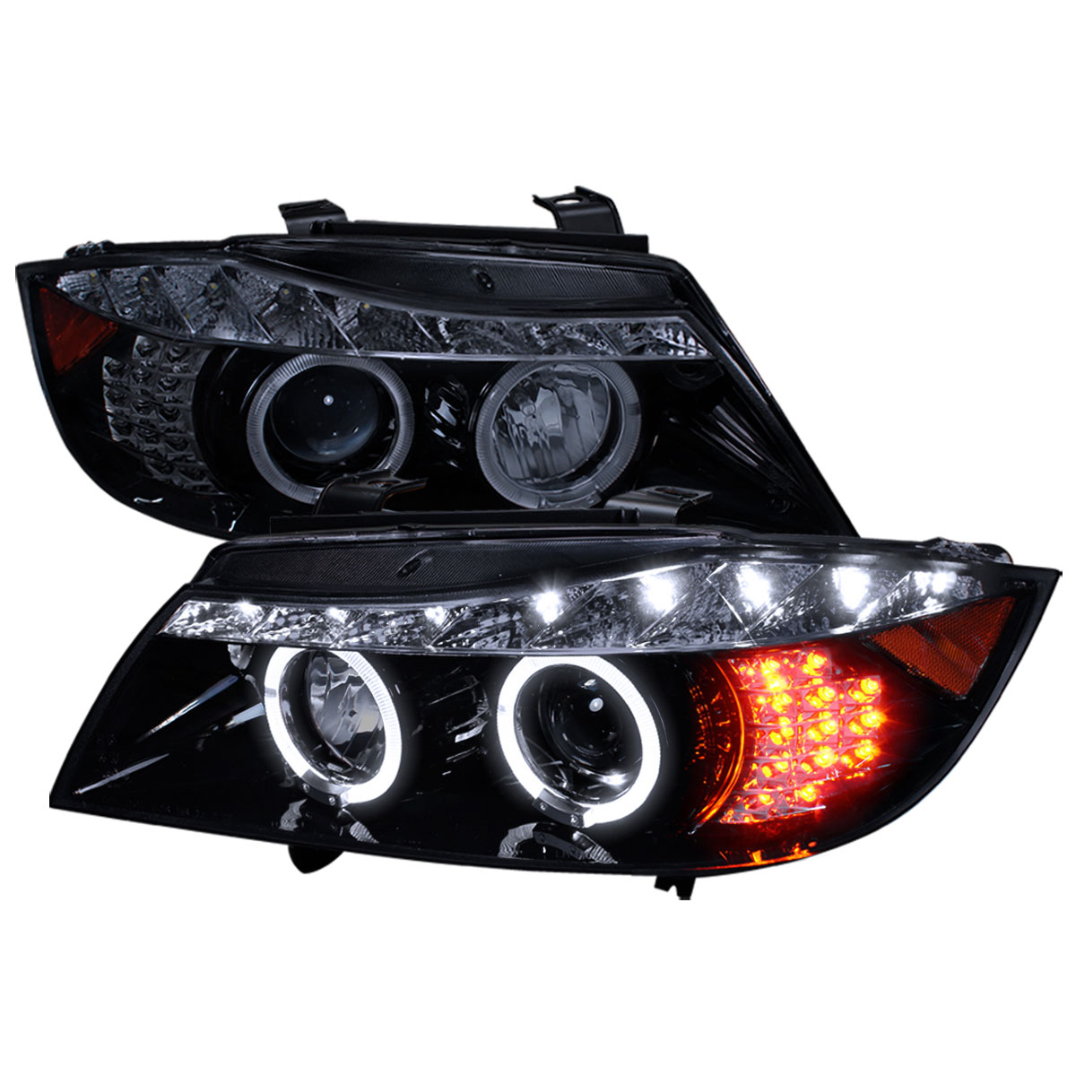 Spec-D Tuning Halo LED Glossy Black Housing Smoke Lens Projector Headlights Compatible with 2006-2008 BMW E90 3-Series 4Dr With Stock Halogen Headlight, Left + Right Pair Headlamps Assembly
