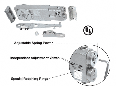 Interchangeable With International, Jackson, and Similar Brands of Overhead Concealed Closers Adjustable Spring power Range of 8-1/2 Pounds to Medium Spring Size Suitable for Doors From 36" to 48" (914 to 1219 mm) to meet A.D.A. Opening Force Requirements 5 Year Limited Warranty and UL Listed The CRL Adjustable Spring Power Overhead Concealed Door Closer is available to meet Federal A.D.A. Opening Force requirements. Available as a body only with mounting clips to retrofit existing non-adjustable closer installations, and as complete packages that includes the Door Closer, Mounting Clips, Type "S" Side-Load Arm or Type "A" End-Load Arm, and a "DP" Adjustable Dual-Purpose Bottom Pivot Set or "GE" Pivot Set. The Closer has independent, dual-action valves to control closing and latching speeds. Both 90 and 105 degree Hold Open and No Hold Open models are available. Closer bodies fit into standard 1-3/4 inch x 4 inch (44 x 102 millimeter), or larger, extrusions. Minimum Order: 1 Each