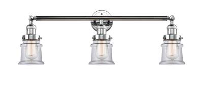 INNOVATIONS LIGHTING 205-PC-G182S-LED Small Canton 3 Light Bath Vanity Light part of the Franklin Restoration Collection. The Small Canton 3 Light Bath Vanity Light is part of the Franklin Restoration Collection. Solid Brass 180 Degree Adjustable Swivels with internal teeth that lock in at 5 degree intervals With Engraved Cast Cup. Collection: Franklin Restoration. Material: Steel, Cast Brass, Glass. Metal Finish(Body): Polished Chrome. Metal Finish(Canopy/Backplate): Polished Chrome. Dimension(in): 30(W) x 10(H) x 9(Ext). Bulb: (3)3.5 Watt LED Vintage Medium Base Bulb Included,Dimmable. Color Temperature: 2700. Color Rendering Index(CRI): 82. Lumens): 350. Voltage: 120. Glass: Clear Canton/Transparent. Shade Shape: Bell. Shade Material: Glass. Shade Size(in): 5.25 X 5.5. Shade Fitter Measurement: 3.25 inch Fitter. Canopy Dimension(in): 4.5. Backplate Dimension(in): 4.5x0.75. Solid Brass 180 Degree Adjustable Swivels with internal teeth that lock in at 5 degree intervals With Engraved Cast Cup. Fixture can be hung with bulbs facing up or down. UL/CUL Damp Rated. Warranty: 2 Year Finish, Lifetime Electrical.