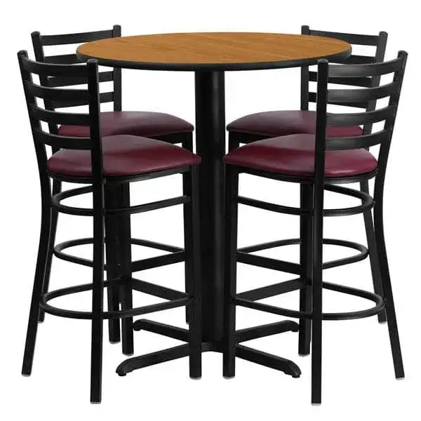 Flash Furniture 30'' Round Natural Laminate Table Set with X-Base and 4 Ladder Back Metal Barstools - Burgundy Vinyl Seat