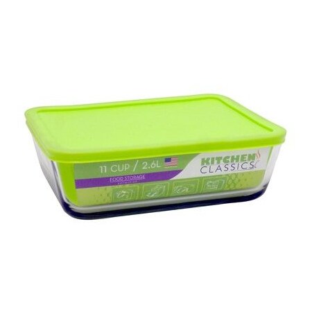 Kitchen Classics, 11 Cup, Tempered Glass Rectangular Premium Food Storage Glass Bowl With Lid, Freezer, Microwave, Dishwasher & Oven Safe, Glass Is Oven Safe To 400 Degrees, Glass Is Lead Free, Lid Is BPA Free, Backed By 2 Year Warranty.
