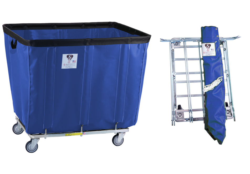 This 6 bushel vinyl basket truck by R&B Wire Products features a fully welded steel base for added durability, along with a flame retardant vinyl liner which is also resistant to mold, mildew, UV and tearing. Ships knocked down for freight savings and easy assembly. This truck comes standard with 3" polyurethane casters. This truck has a weight capacity of 250 lbs. Total caster rating: 600 lbs. Commercial grade 18 oz vinyl liner is flame retardant as well as mold, mildew, and tear resistant. Powder coated fully tubular steel base and frame provide additional strength and durability. Ships knocked down for freight savings and easy assembly. Equipped with 3" non marking casters in an all swivel configuration for smooth rolling. This truck has a weight capacity of 250 lbs. Total caster rating: 600 lbs. Made in USA.<br><br>