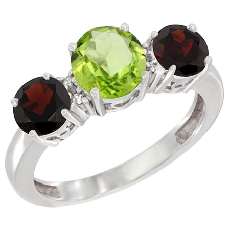 10K White Gold Round 3-Stone Natural Peridot Ring & Garnet Sides Diamond Accent, sizes 5 - 10