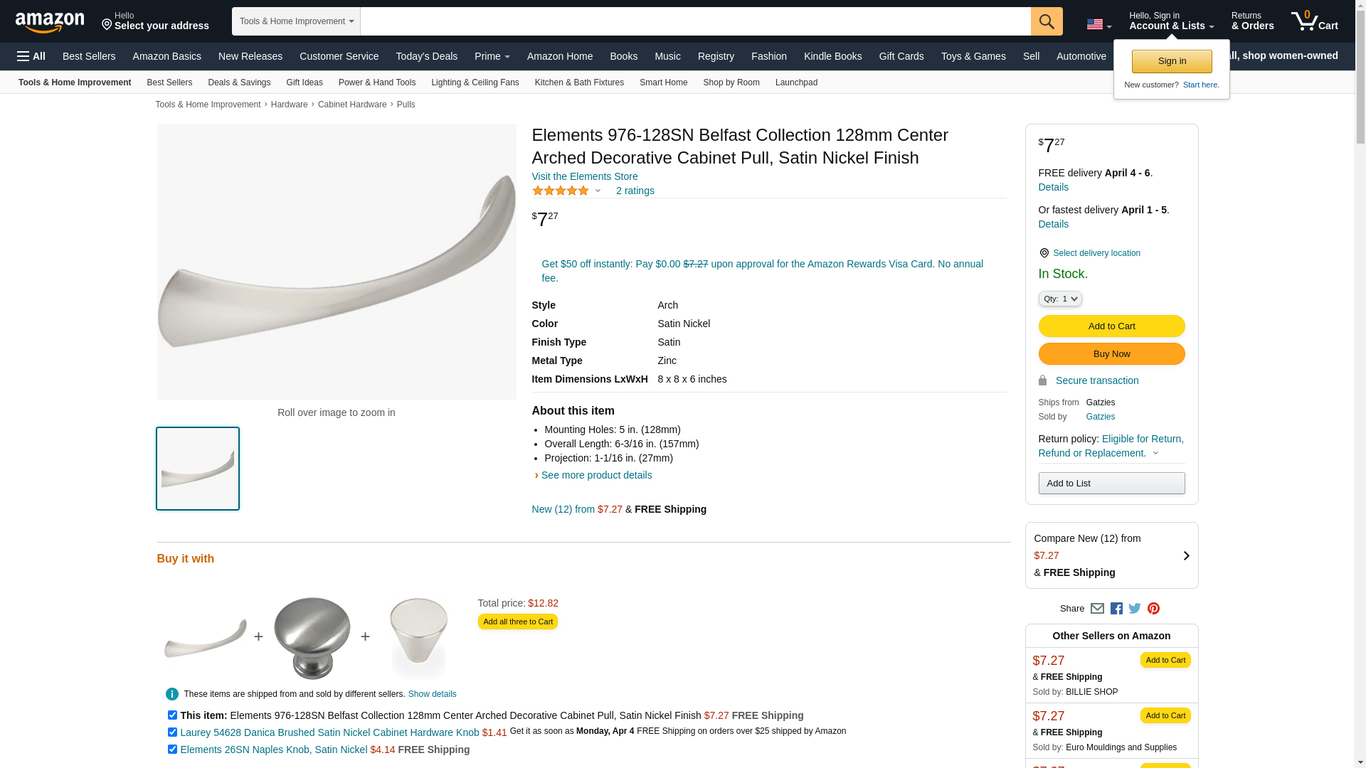 Elements 976-128SN Belfast Collection 128mm Center Arched Decorative Cabinet Pull, Satin Nickel Finish