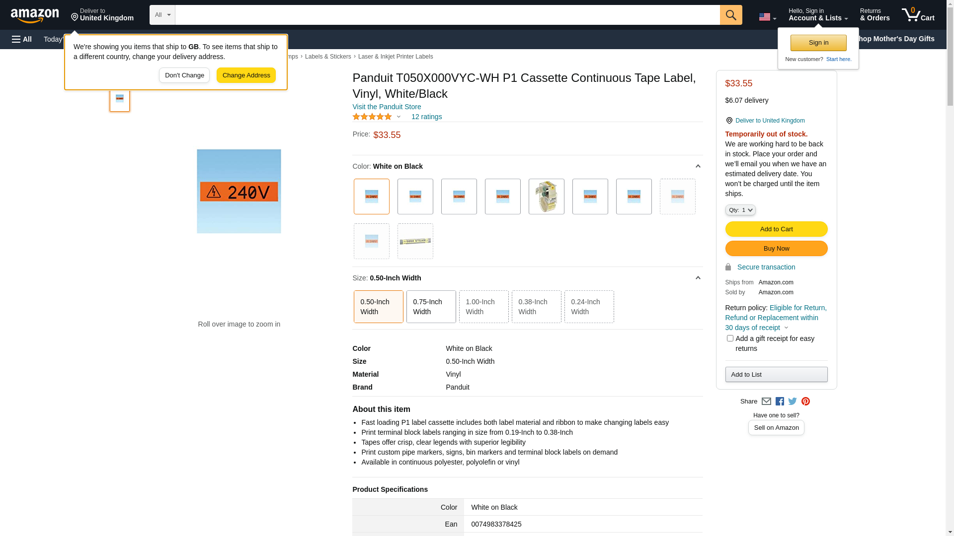 Panduit P1 Cassette, Continuous Tape, Vinyl, .50 Rohs Compliant: Yes - T050X000VYC-WH