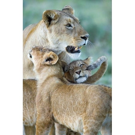 Panoramic Images Stretched Canvas Art - Close-up of a lioness and her two cubs, Ngorongoro Crater, Ngorongoro Conservation Area, Tanzania (Panthera leo) - Medium 16 x 24 inch Wall Art Decor Size.