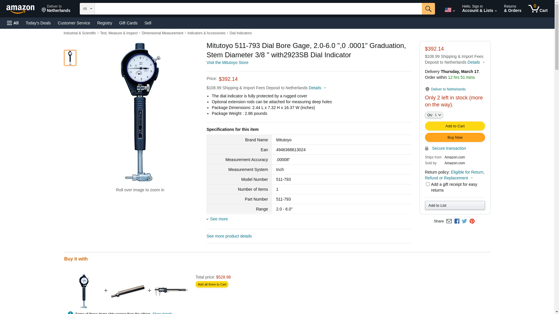 Mitutoyo 511-793 Dial Bore Gage, 2.0-6.0 ",0 .0001" Graduation, Stem Diameter 3/8 " with2923SB Dial Indicator