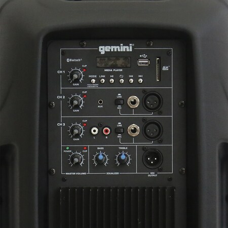- ENDLESS AUDIO OPTIONS The Gemini speaker and Portable Bluetooth PA system features 2 input channels with separate gain controls. Switchable Line/Mic XLR and 1/4” inputs plus RCA and 1/8” AUX input. Master high/low equalization controls allow you to dial the perfect sound. XLR mix output allows for connecting to additional speakers.