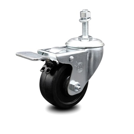 Soft Rubber Swivel Threaded Stem Caster w/3" x 1.25" Black Wheel and 3/8" Stem & Total Locking Brake - 175 lbs Capacity/Caster - Service Caster Brand