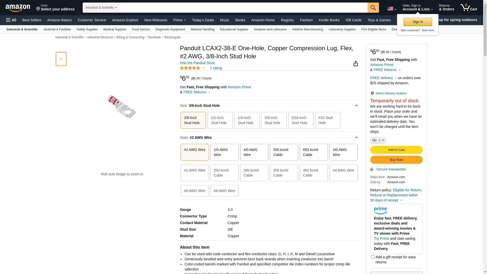 Panduit LCAX1/0-38-X Copper Compression Lug, 1 Hole, 1/0 AWG Flex, 3/8-Inch Stud