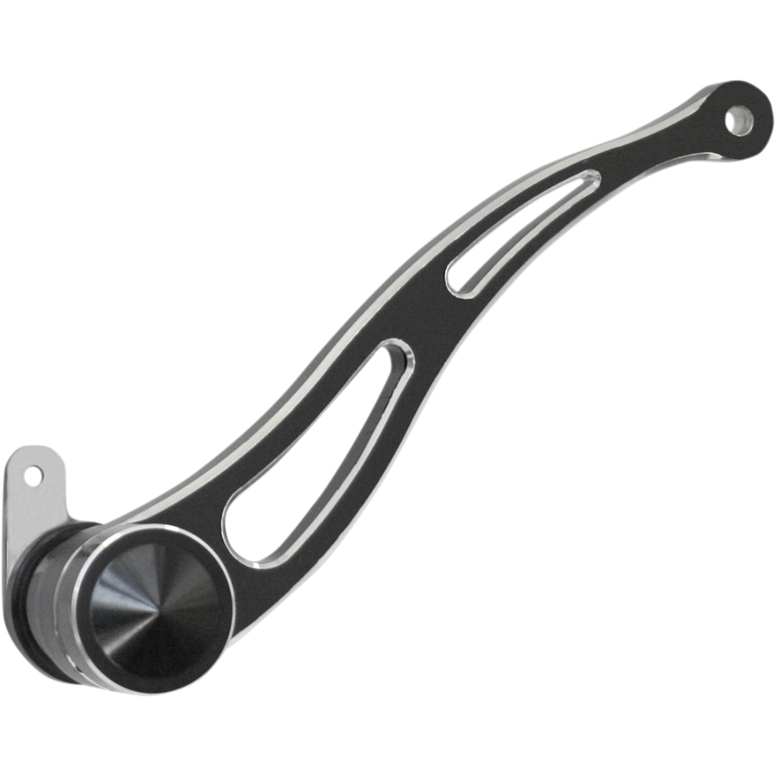 • Machined from billet aluminum• Replaces stock brake arm• 9-3/4″ from center of pivot to center of toe peg• Toe peg sold separately• Decorative cap to conceal the mounting hardware• Black anodized then machined again for a final contrasting finish of raw aluminum and black anodize