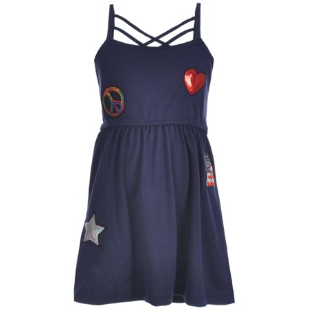 A crisscross racerback design and sequined appliqus make this Star Ride dress a winner! <ul> <li>Star Ride dress</li> <li>Stretch poly construction</li> <li>Elastic waist</li> <li>Crisscross racerback design</li> <li>Sequined patches and appliqus</li> <li>95% polyester, 5% spandex</li> <li>Machine wash cold, inside out</li> <li>Imported</li> </ul>