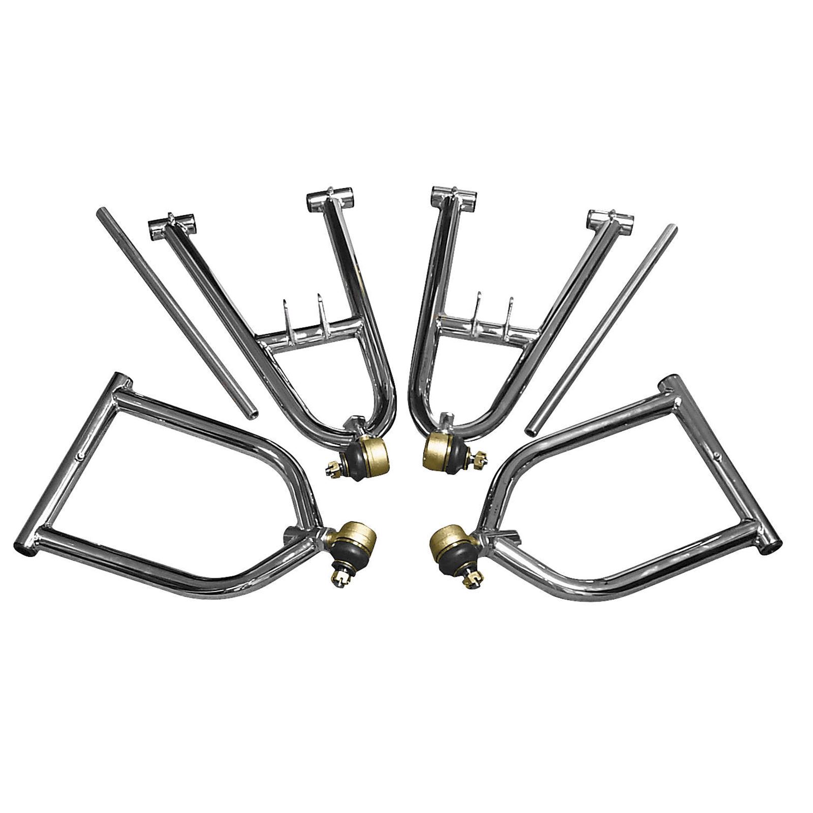 - A-arms are backed by a lifetime warranty (excluding normal wear items); they use standard lengths shocks but require proper valving for optimal performance; extended brake lines are required