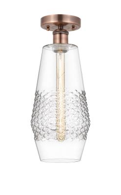 INNOVATIONS 616-1F-AC-G682-7 Windham 1 7 inch Flush Mount Antique Copper. Style: Industrial, Modern Contempo, Restoration-Vintage, Transitional . Collection Name: Edison. Metal Finish(Body): Antique Copper. Metal Finish(Canopy/Backplate): Antique Copper. Material: Steel, Cast Brass, Glass. Dimension(in): 16.75(H) x 7(W) x 7(Dia). Bulb: (1)5W LED(Included). Voltage: 120. Dimmable: Yes. Color Temperature (Kelvin): 2700. Color Rendering Index (CRI): 80. Lumens: 500. Life Expectancy (Hours): 15000. Glass Shade Description: Clear Windham. Glass Type: Transparent. Shade Shape: Cone. Glass or Metal Shade Color: Clear. Shade Material: Glass. Shade Dimension(in): 7(W) x 13(H). Fitter Measurement (Glass Or Metal Shade Fitter Size): Neckless with a 1.625 inch opening. Canopy Dimension(in): 0.75(H) x 4.5(Dia). Sloped Ceiling Compatible: No. California Proposition 65 Warning Required: Yes. UL/ETL Certification Type: Damp Location.
