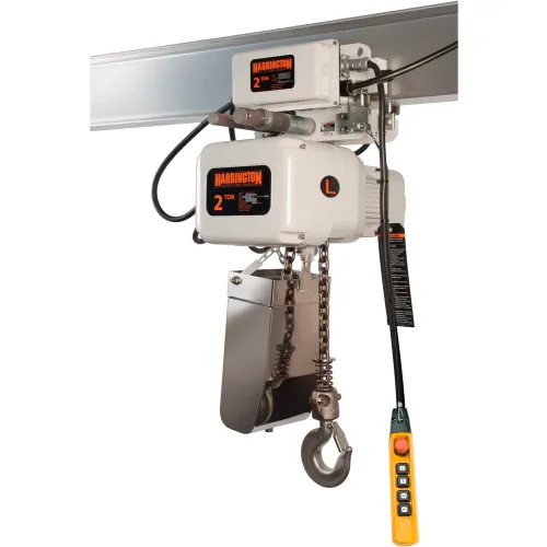 Harrington NERM003L-L-FG-10 Series NER-FG Three Phase Food Grade Electrical Hook Mount Chain Hoist with Single Speed Trolley, 40 fpm Low Traversing Speed, 1/4 Tons Capacity, 10' Lift